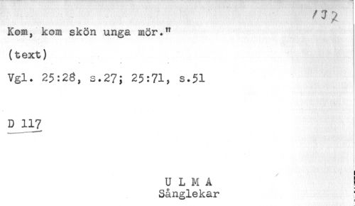 //// Kom, kom skön unga mör." //// (text) //// . * - . w //// Vgl. 25:28, s.27; 25:71, s.51 //// D 117 //// U L M A I //// Sånglekar ; ////