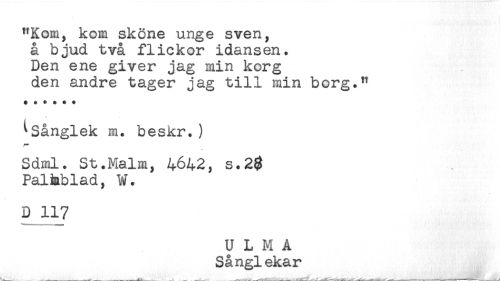 //// "Kom, kom sköne unge sven, //// å bjud två flickor idansen. //// Den ene giver jag min korg //// den andre tager jag till min borg." //// ^Sånglek m. beskr.) //// Sdml. St.Malm, 4642, s.2$ //// Paliablad, W. //// D 117 //// U L M A //// Sånglekar //// _„ ... _______________ ////