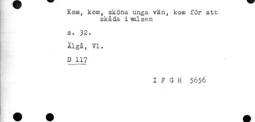 //// Kom, kom, sköna unga vän, kom för att //// skåda i-valsen //// s. 32. //// Älgå, VI. //// D 117 //// I F G H 5656 ////