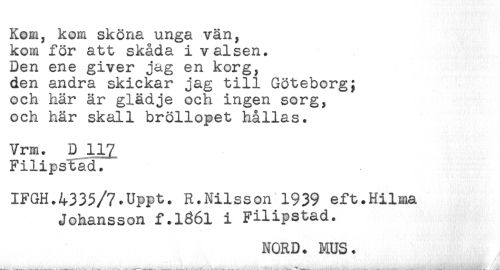 //// Kom, kom sköna unga vän, //// kom för att skåda i valsen. //// Den ene giver jag en korg, //// den andra skickar jag till Göteborg; //// och här är glädje och ingen sorg, //// och här skall bröllopet hållas. //// Vrm. D 112 //// Filipstad. //// IFGH.4335/7*Uppt. R.Nilsson'1939 eft.Hilma //// Johansson f.l86l i Filipstad. //// NORD. MUS. ////