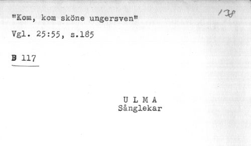 //// "Kom, kom sköne ungersven" //// Vgl. 25:55, s.135 //// B 117 //// **' //// U L M A //// Sånglekar ////