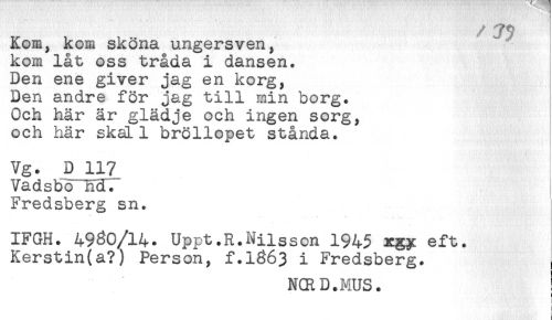 //// Kom, kom sköna ungersven, //// kom låt oss tråda i dansen. //// Den ene giver jag en korg, //// Den andre för jag till min borg. //// Och här är glädje och ingen sorg, //// och här skäLl bröllopet stånda. //// Vg. D 117 //// Vadsbon^cTT //// Fredsberg sn. //// IFGH. 4960/14. Uppt.R.Nilsson 1945 xgy eft. //// Kerstin(a?) Person, f.1663 i Fredsberg. //// NCR D.MUS. //// f ////