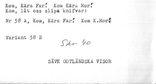 //// Rom, Rara i*ar. Rom Rara Flor. //// Kom, låt oss slipa knifvar: //// Nr A, Kom, Kära Far? Kom K.Mor3 //// Variant $3 B //// SÄVE GOTLÄNDSKA VISOR //// ' .' ' ////