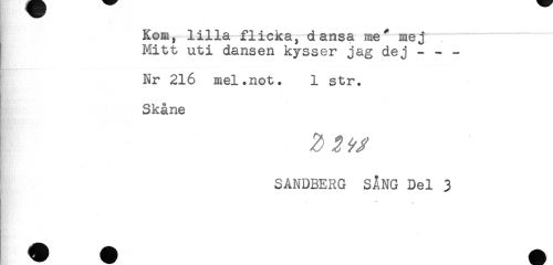 //// [ Kom, lilla flicka, dansa me* mej —^ * //// Mitt uti dansen kysser jag dej - - - //// Nr 216 mel.not. 1 str. //// Skåne //// - //// . //// SANDBERG SÅNG Del 3 //// t< A //// * ////