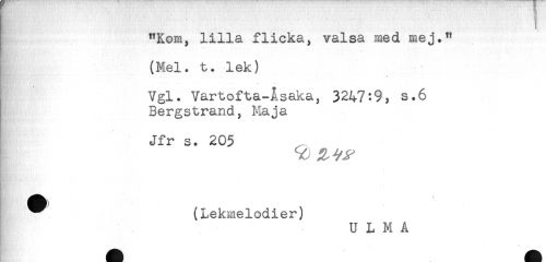 //// n //// "Kom, lilla flicka, valsa med mej." //// (Mel. t. lek) //// fi - - -* //// Vgl. Vartofta-Asaka, 3247:9, s.6 //// Bergstrand, Maja //// Jfr s. 205 //// . - //// h //// ^ (Lekmelodier) //// ^ , U L M Å ////