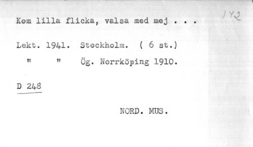 //// Kom lilla flicka, valsa med mej . . . //// Lekt. 1941- Stockholm. ( 6 st.) //// " " Ög. Norrköping 1910. //// D 243 //// NORD. MUS. ////