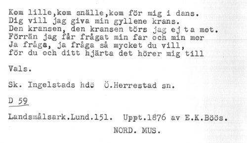 //// Kom lille,kom snälle,kom för mig i dans. //// Dig vill jag giva min gyllene krans. //// Den kransen, den kransen törs jag ej ta mot. //// Förrän jag får frågat min far och min mor //// Ja fråga, ja fråga så mycket du vill, //// för du och ditt hjärta det hörer mig till //// Vals. //// Sk. Ingelstads hdö Ö.Herrestad sn. //// D__59 //// Landsmålsark.Lund.151. Uppt.1876 av E.K.Böös. //// NORD. MUS. ////