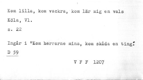 //// Kom lilla, kom vackra, kom lär mig en vals //// Köla, VI. //// s. 22 //// * //// Ingår i "Kom herrarne mina, kom skåda en tingf //// D 59 //// V F F 1207 ////