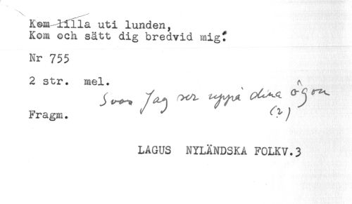 //// Kom-lllla uti lunden, //// Kom och satt dig bredvid migt //// Nr 755 //// 2 str. mel. <\ //// ^ ^ ^ //// Fragm. ^ ^ //// LAGUS NYLÄNDSKA FOLKV.3 ////