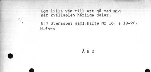 //// ^ - - . - - - * " - ---*. //// ^ Kom lilla vän till att gå med mig //// ! när kvällsolen härliga dalar, //// ! ^ 8:7 Svenssons saml.häfte Nr 16. s.19-20. //// H-fors //// ÅBO ////