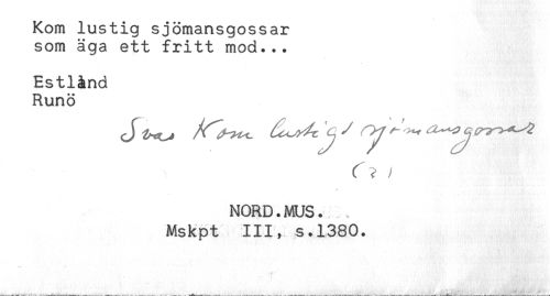 //// Kom lustig sjömansgossar //// som äga ett fritt mod... //// Estlånd //// Runö //// r? / //// NORD.MUS. //// Mskpt III, s.1380. //// t ' - *)*' ////