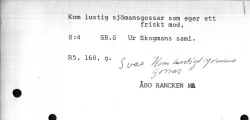 //// ' * - - //// Kom lustig sjömansgossar som eger ett //// ^ friskt mod, //// 8:4 SB.ö Ur Skogmans saml. //// = //// R5, 168, g. //// ^ ÅBO RANCKEN M& //// * ^ ////