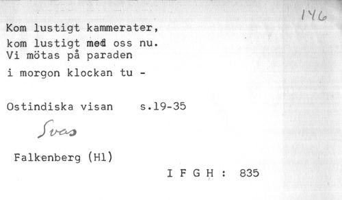 //// Kom lustigt kammerater, //// kom lustigt med oss nu. //// Vi mötas på paraden //// i morgon klockan tu - //// Ostindiska visan s.19-35 //// Falkenberg (Hl) //// I F G H : 835 ////
