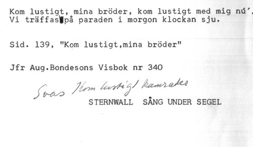//// Kom lustigt, mina bröder, kom lustigt med mig nt3', //// Vi träffas^på paraden i morgon klockan sju. //// Sid. 139, "Kom lustigt,mina bröder" //// Jfr Aug.Bondesons Visbok nr 340 //// ^ SIERNWALL SÅNG UNDER SEGEL ////
