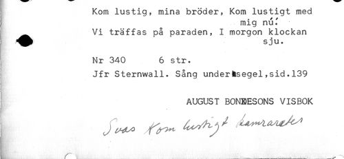 //// Kom lustig, mma broder, Kom lustigt med //// * mig nuf //// i ^^ Vi träffas på paraden, I morgon klockan //// Nr 340 6 str. //// f //// Jfr Sternwall. Sång undersegel,sid. 139 //// AUGUST BONBESONS VISBOK ////