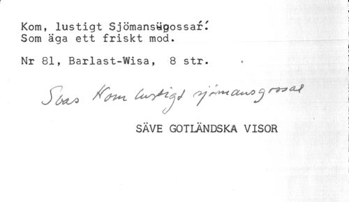 //// Kom, lustigt Sjömansgossar^ //// Som äga ett friskt mod. //// i //// < //// c //// Nr 81, Barlast-Wisa, 8 str. . ! //// SÄVE GOTLÄNDSKA VISOR ////
