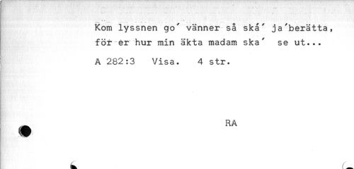 //// ' . . . //// . .. ... . . - .. //// . # * - * //// Kom lyssnen go^ vänner så skå^ ja^berätta, //// * //// förmer hur min äkta madam ska^ se ut... //// A 282:3 Visa. 4 str. //// # ////