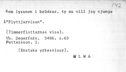 //// /Y^ //// Kom lyssnert i brödrar, ty nu vill jag sjunga //// å"Flyttjarvisan". //// a //// (Timmerflottarnas visa). //// Vb. Degerfors, 5486, s.63 //// Pettersson, 1. //// (Enstaka yrkesvisor). //// M L M A ////