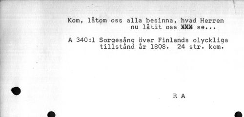 //// — ....... .... - ... //// Kom, låtom oss alla besinna, hvad Herren //// nu låtit oss XXX se... //// A 340:1 Sorgesång över Finlands olyckliga //// tillstånd år 1808. 24 str* kom. //// ' //// . ^ //// ^ RÅ ////