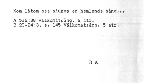 //// Kom låtom oss sjunga en hemlands sång... //// A 516:38 Välkomstsång. 6 str. //// B 23-24:3, s. 145 Välkomstsång. 5 str. //// R A ////