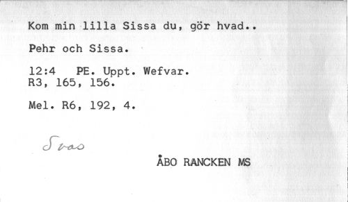 //// Kom min lilla Sissa du, gör hvad.. //// Pehr och Sissa. //// ..... //// 12:4 PE. Uppt. Wefvar. //// R3, 165, 156. //// ! //// i //// Mel. R6, 192, 4. //// ÅBO RANCKEN MS //// < //// t //// t ////