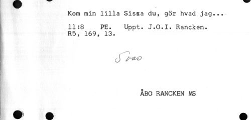//// Kom min lilla Sissa du, gör hvad jag... //// j 11:8 PE. Uppt. J.O.I. Rancken. //// i R5, 169, 13. //// [ J ^^ //// ÅBO RANCKEN MS ////
