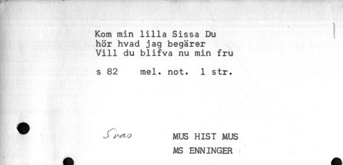 //// j //// Kom min lilla Sissa Du { //// hör hvad jag begärer //// Vill du blifva nu min fru //// . //// * s < //// s 82 mel. not. 1 str. //// - //// * //// ! ^ Jl^? MUS HIST MUS //// MS ENNINGER //// s.*- , - -'K&,'.. itctLt*''{ ////