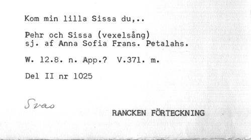 //// Kom min lilla Sissa du,.. //// Pehr och Sissa (vexelsång) //// sj. af Anna Sofia Frans. Petalahs. //// W. 12.8. n. App.? V.371. m. //// Del II nr 1025 //// RANCKEN FÖRTECKNING ////