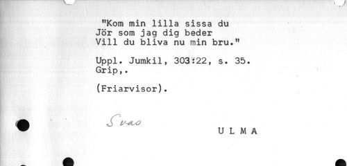 //// "Kom min lilla sissa du //// Jör som jag dig beder //// Vill du bliva nu min bru." //// Uppl. Jumkil, 303i22, s. 35. //// Grip,. //// (Friarvisor). //// ^ U L M A ////