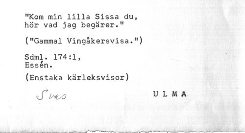 //// "Kom min lilla Sissa du, //// hör vad jag begärer." //// ("Gammal Vingåkersvisa.") //// Sdml. 174:1, //// Essen. //// (Enstaka kärleksvisor) //// U L M A ////