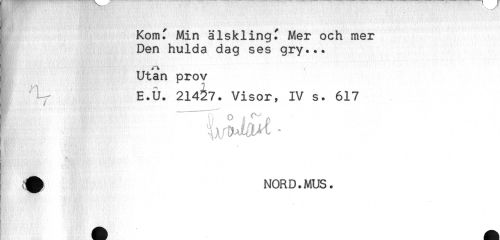 //// Komf Min älsklingf Mer och mer //// Den hulda dag ses gry... //// Utan prov //// } 21427. Visor, IV s. 617 //// T //// ^ NORD. MUS. ////