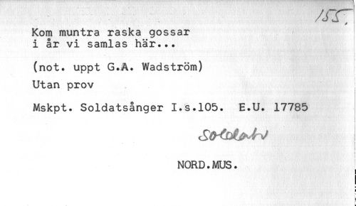 //// /JJT //// Kom muntra raska gossar //// i år vi samlas här... //// (not. uppt G.A. Wadström) //// Utan prov //// Mskpt. Soldatsånger I.s.105. E.U. 17785 //// : //// ! //// i //// ! //// i //// NORD.MUS. //// h //// ) //// t- //// * ////