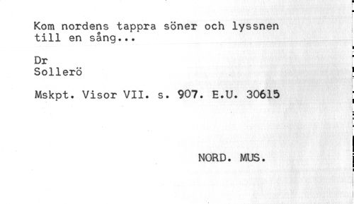 //// r //// Kom nordens tappra söner och lyssnen //// till en sång... //// Dr ; //// Sollerö ! //// Mskpt. Visor VII. s. 907. E.U. 30615 ; //// E //// NORD. MUS. j //// < ////