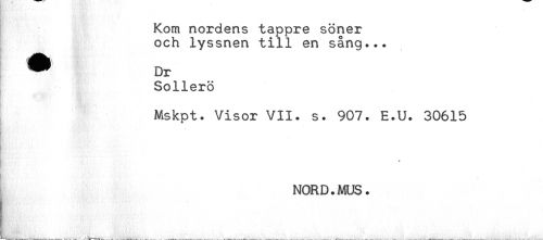 //// Kom nordens tappre söner //// och lyssnen till en sång... //// B - — //// * Dr //// Sollerö //// Mskpt. Visor VII. s. 907. E.U. 30615 //// - //// ' //// * //// NORD.MUS. ////