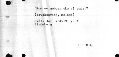 //// - //// j "Kom nu gubbar ska vi supa." //// (dryckesvisa, melodi) //// Smål. Jät, 2349:3, s. 4 //// Strömberg //// t!*''/ //// ! //// y U L M A ////