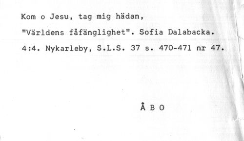 //// Kom o Jesu, tag mig hädan, //// "Världens fåfänglighet". Sofia Dalabacka. //// 4:4. Nykarleby, S.L.S. 37 s. 470-471 nr 47. //// ' i //// + //// A B O //// . - //// t. ////
