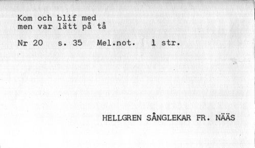 //// Kom och blif med //// men var lätt på tå //// Nr 20 s. 35 Mel.not. i str. //// - //// - //// HELLGREN SÅNGLEKAR FR. NÄÄS ////