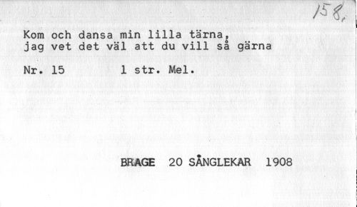 //// 3, I //// Kom och dansa min lilla tärna, //// jag vet det väl att du vill så gärna //// Nr. 15 1 str. Mel. //// BRAGE 20 SÅNGLEKAR 1908 //// i //// f ////
