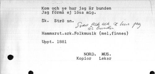 //// T ' . K * ----1 t //// Kom och se hur jag är bunden //// Jag förmå ej lösa mig. //// Sk. Strö sn. //// Hammarst.ark.Folkmusik (mel,finnes) //// Uppt. 1881 //// — NORD. MUS. //// ^ Kopior Lekar ////