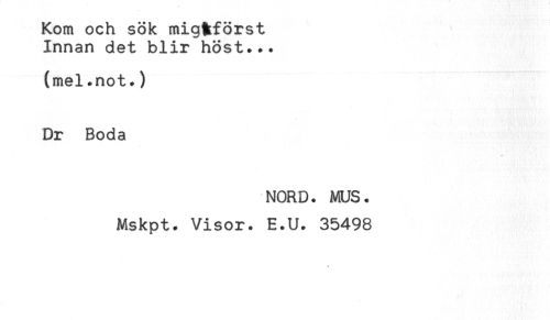 //// Kom och sök migtförst //// Innan det blir höst... //// (mel.not.) //// Dr Boda //// NORD. MUS. //// Mskpt. Visor. E.U. 35498 ////