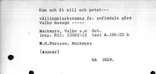 //// Kom och ät sill och potat--- //// vällingklocksramsa fr. sofiedals gård //// Valbo masugn ----- //// Mackmyra^ Valbo s^n Gst. //// insp. Rtj. 12062:12 text A.186:22 b //// R.N.Persson. Mackmyra //// (ramsar) //// * RA INSP. ////
