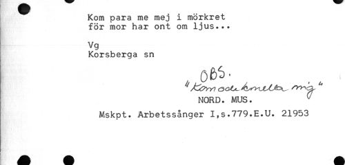 //// Kom para me mej i mörkret //// för mor har ont om ljus... //// Vg //// Korsberga sn //// NORD. MUS. ^ //// Mskpt. Arbetssånger I,s.779.E.U. 21953 ////