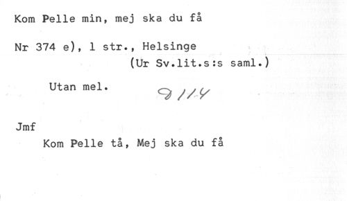 //// Kom Pelle min, mej ska du få //// Nr 374 e), 1 str., Helsinge //// (Ur Sv.lit.s:s saml.) //// Utan mel. ^ ^^ //// Jmf //// Kom Pelle tå, Mej ska du få ////