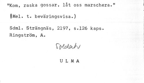 //// "Kom, rasxa gossar, oss marscnera." ! //// ! //// L //// §Mel. t. beväringsvisa.) //// < //// Sdml. Strängnäs, 2197, s.126 kaps. //// Ringström, A. //// t //// ULMA ////