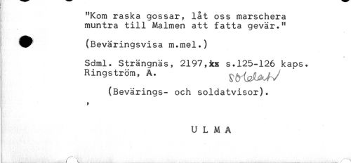 //// "Kom raska gossar, låt oss marschera //// muntra till Malmen att fatta gevär." //// V (Beväringsvisa m.mel.) //// * //// Sdml. Strängnäs, 2197,ks s.125-126 kaps. //// j Ringström, A. //// (Bevärings- och soldatvisor). //// U L M A //// ( k ////