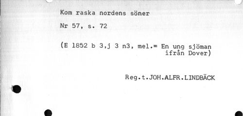 //// Kom raska nordens söner //// Nr 57, s. 72 //// (E 1852 b 3,j 3 n3, mel.= En ung sjöman //// ifrån Dover) //// i //// R e g.t.JOH.ALFR.LINDBÄCK //// 'O h ////