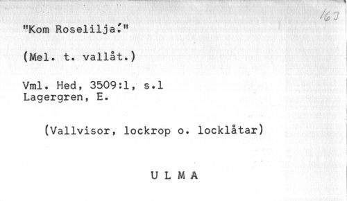 //// "Kom Roselilja^" //// ! //// t //// i //// (Mel. t. vallat.) //// t //// Vml. Hed, 3509:1, s.l //// Lagergren, E. //// i* //// (Vallvisor, lockrop o. locklåtar) //// i //// U L M Å ////