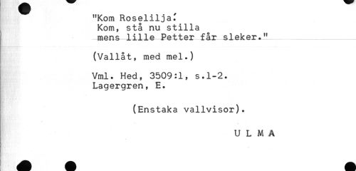 //// "Kom Roselilja^ //// Kom, stå nu stilla //// mens lille Petter får sleker." //// (Vallåt, med mel.) //// Vml. Hed, 3509:1, s.1-2. //// Lagergren, E. //// (Enstaka vallvisor). ////