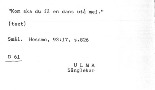 //// "Kom ska du få en dans utå mej." //// (text) ! //// t //// Smål. Hossmo, 93:17, s.826 //// ? //// i //// D 61 ! //// U L M A //// Sånglekar ////