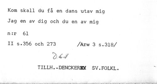 //// Kom skall du få en dans utav mig //// Jag en av dig och du en av mig //// n :r 61 //// II s*356 och 273 /Arw 3 s.318/ //// TILLH.-DENCKERXX SV,FOLKL. //// r^f—------ — —-. —- — . r-.^!-. < — —. ^^---——- — —.---..T—^ --- ----r** '——-----n----'--—yr—— -----——T* *"'-- ----—" ////